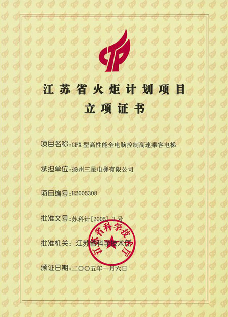省火炬计划立项证书(客梯(27))