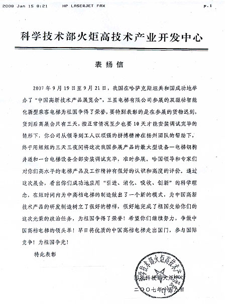 科学技术部火炬高技术产业开发中心 表扬信
