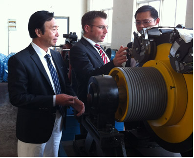 阿贝格公司专家在三星实地考察阿贝格电机的运用,对三星的国际专利三点式桥式结构无齿轮曳引机大加赞赏